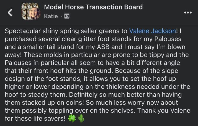 Linnea: “The foot stands work great! The foot stand with the dip in the top works for the Weather Girl Arabian. The flat stand didn't work for the Weather Girl, but it works great for a tippy Troubadour Morgan I have!” |